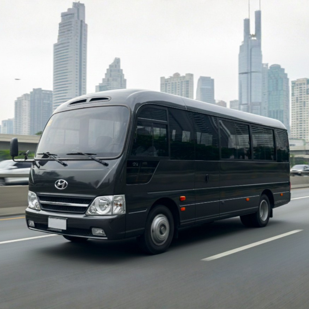 The Hyundai County for rent can comfortably accommodate up to 24 passengers plus spacious rear and overheads for your handcarries and luggage.